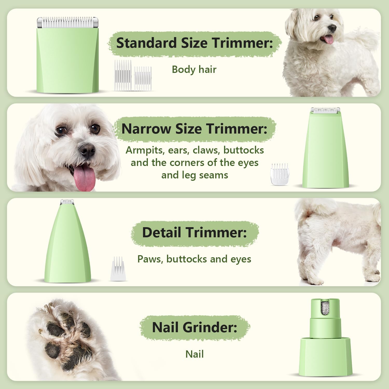 Includes 4 heads—standard, narrow, detail blades, and nail grinder—for full-body pet trimming.